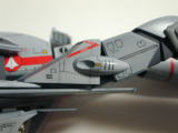 でも、やっぱりハゼガワじゃないとこれは出来ないだろうって表現が随所にあるんだよね。 例えば航空機形態のときにドーサルスパン(キャノピー後ろの膨らみ)部分が、ロボット形態では少し沈んで、たたまれた尾翼基部ユニットが真っ直ぐ背中に張り付くようになっているところとかね。 さらにドーサルスパン上のアンテナが中央で折りたたまれた2枚の尾翼の間に収まるようになっていて、『成程!』って思うよ。 このあたり、実際のキットでぜひ見てほしい。